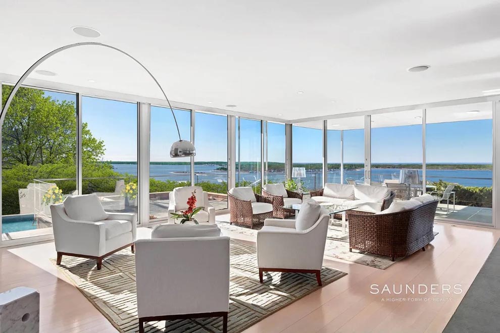 Set on 3.41 acres, the three-story residence overlooks Peconic Bay, the North Fork, Long Island Sound, and, on clear days, has views to the Connecticut shoreline. The design uses expanses of glass to open the house to its surroundings, keeping the landscape in constant view.