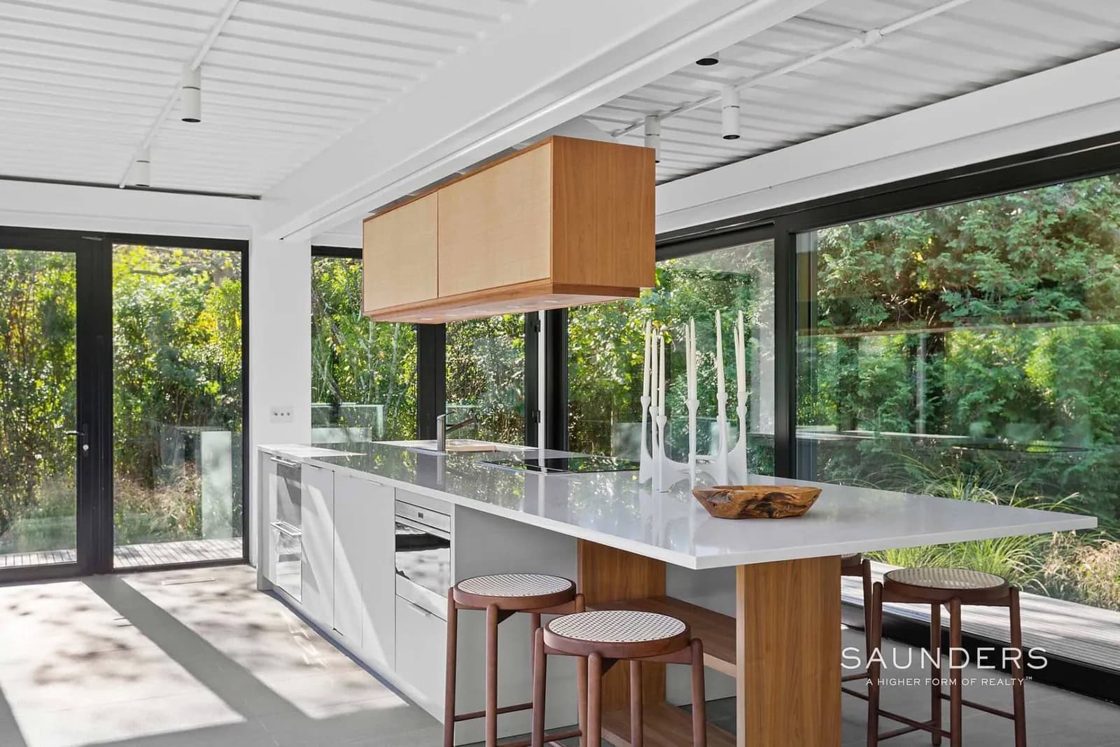 Attached by a courtyard is a bright, contemporary steel-and-glass residence, designed by Tom Morbitzer of Ammor Architecture LLP. Inside, a great room with open kitchen a sleek sliding glass wall opens into the courtyard and visually connects the interior and exterior. Outdoor amenities are thoughtfully integrated: an infinity-edge pool and spa flow into a wraparound pond, while a rooftop lounge framed by muted beach grass offers privacy with views.