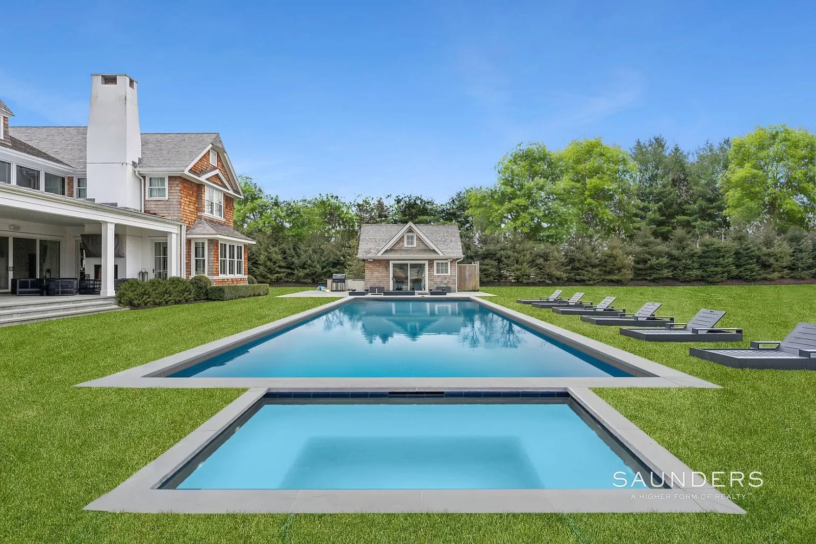 The outdoor oasis is further enhanced by an expansive deck, a dedicated pool house, and a refreshing outdoor shower, all surrounded by lush, manicured grounds that ensure total privacy.