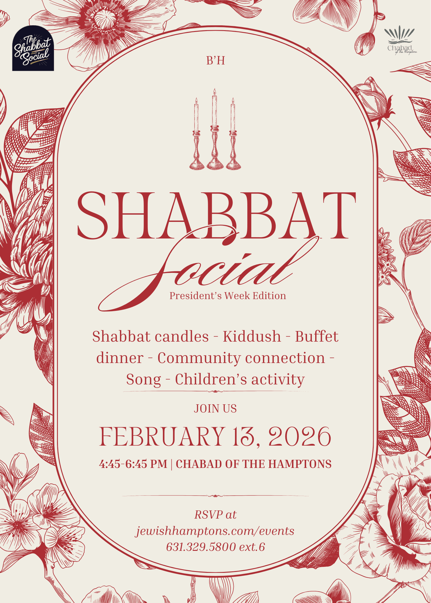 Shabbat is better together. Join us for our Shabbat Social – President’s Week Edition with candles, kiddush, dinner, music, and fun for the kids! RSVP HERE