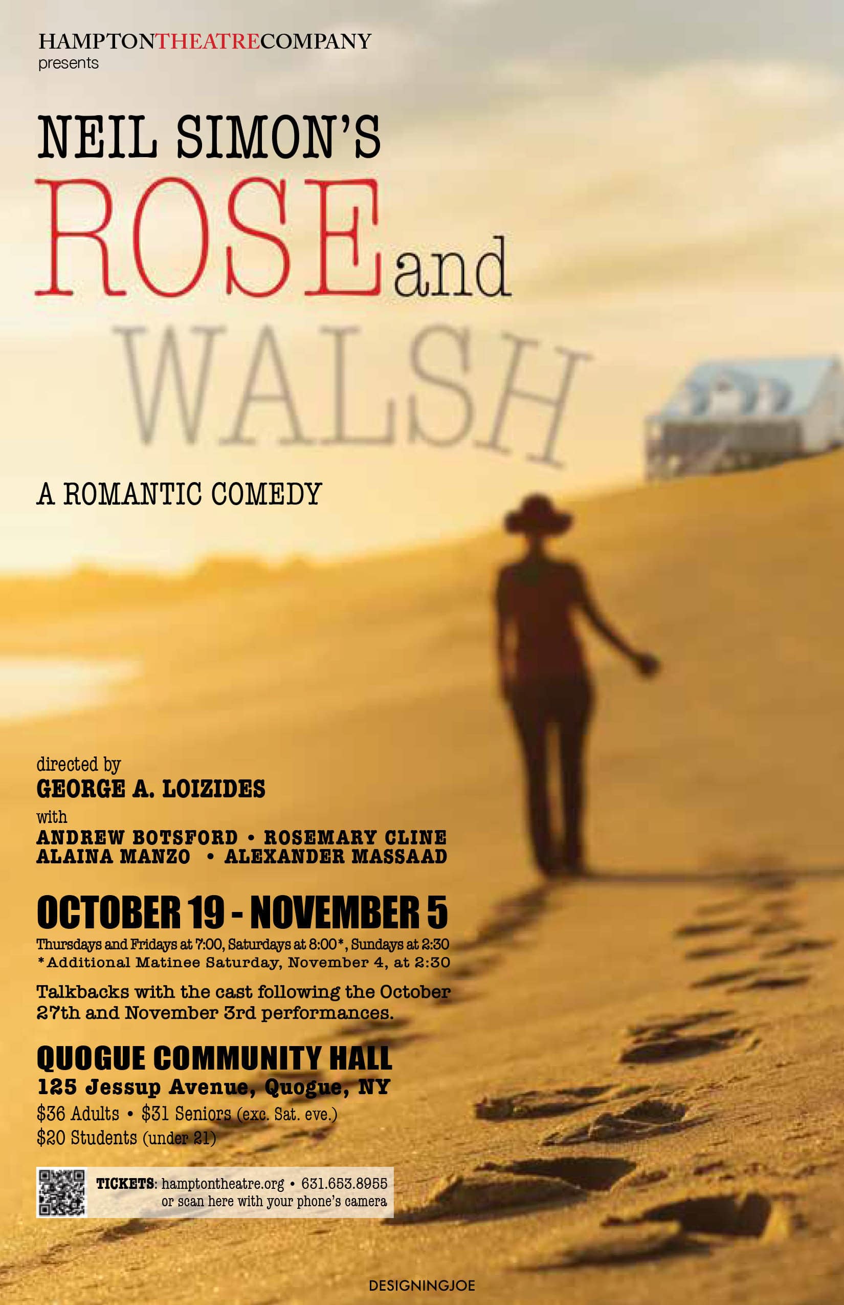 “Rose and Walsh,” a romantic comedy from acclaimed playwright, screenwriter and author Neil Simon, will kick off the Hampton Theatre Company’s 2023-2024 season, with performances running from October 19 through November 5 at the Quogue Community Hall. The company’s 39th season is dedicated to Don and Judy Gruhn, Quogue residents and longtime friends and supporters of the HTC.