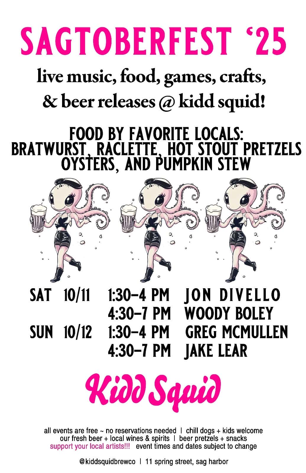Experience Oktoberfest in Sag Harbor at Kidd Squid! Special bites include bratwurst, raclettes, hot stout pretzels, oysters, and pumpkin stew. The live music lineup is exceptionally impressive, with performances by Jon Divello, Woody Boley, Greg McMullen, and Jake Lear!