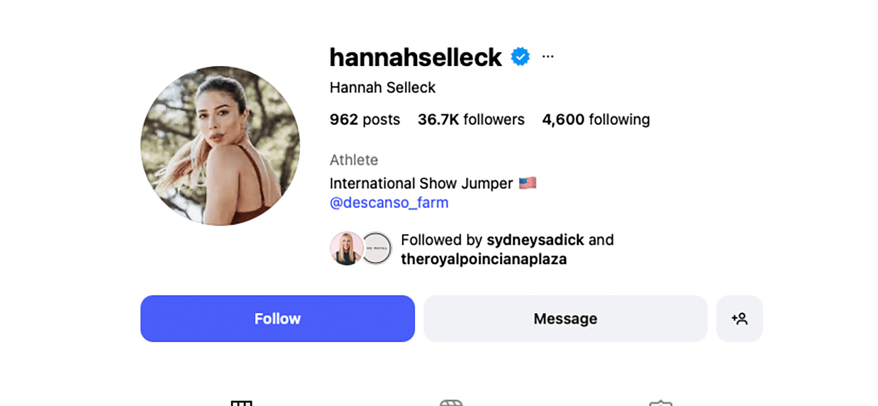 Hannah Selleck merges show-jumper grit with beachside elegance. You’ll see horse-farm visuals, breezy vacation shots, and refined eveningwear making equal appearances here. This is athletic luxury with an island glow, perfect for those who like their style with a side of horsepower.